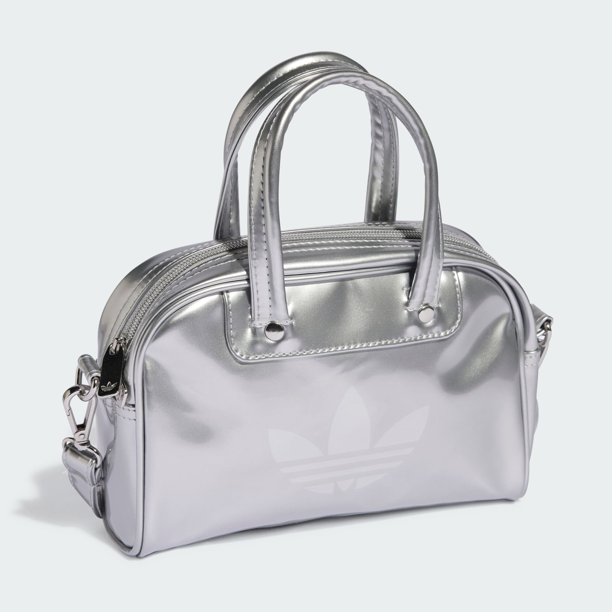 Mit der Adicolor Mini-Bowlingtasche von adidas, die einem Archiv-Style nachempfunden ist, kannst du deine wichtigsten Kleinigkeiten im Retro-Flair transportieren. Egal, ob du sie dir über die Schulter hängst oder an den Henkeln trägst, das glänzende Lackleder-Finish und die kontrastierenden Details der Tasche setzen ein stilvolles Statement. Ein längenverstellbarer, abnehmbarer Riemen bietet verschiedene Trageoptionen und Metallnieten sorgen für einen hochwertigen Touch. Das glänzende Trefoil rundet den Look ab.