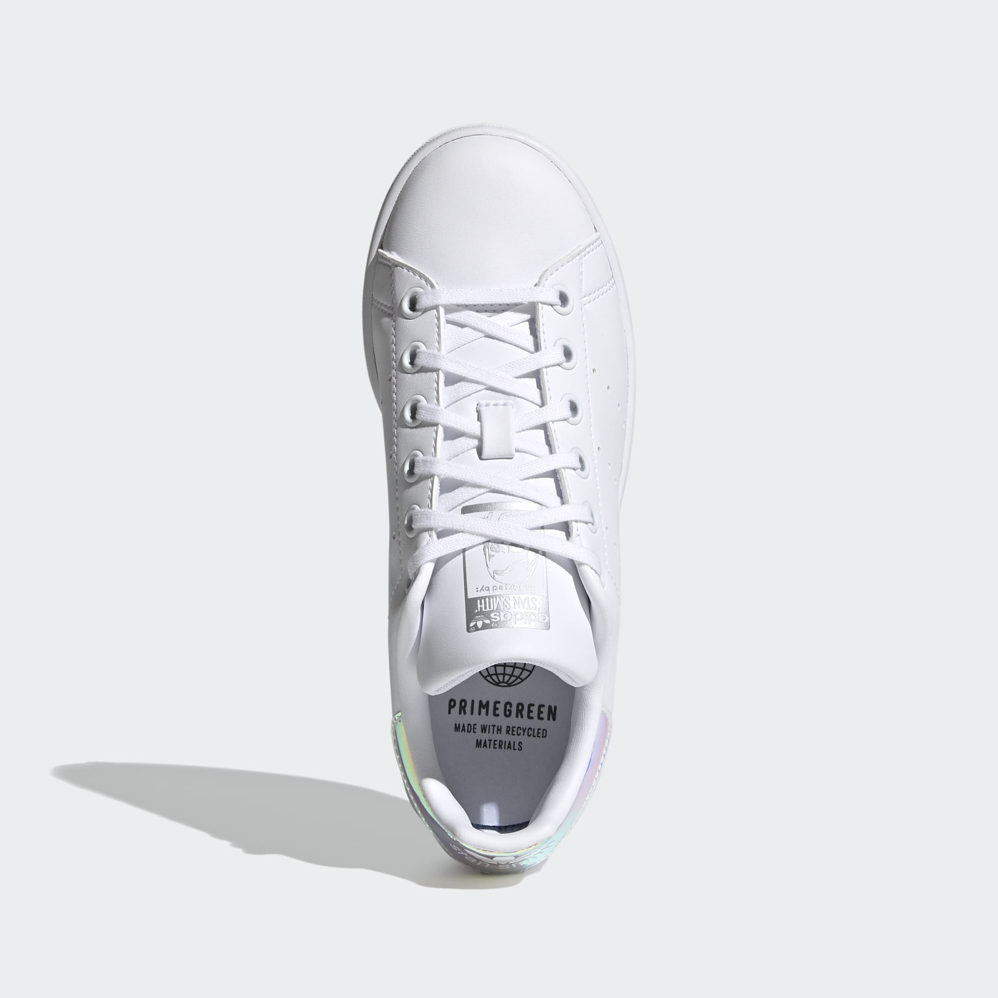 Stan Smith logos on the tongue and heel tab are paired with three perforated stripes.