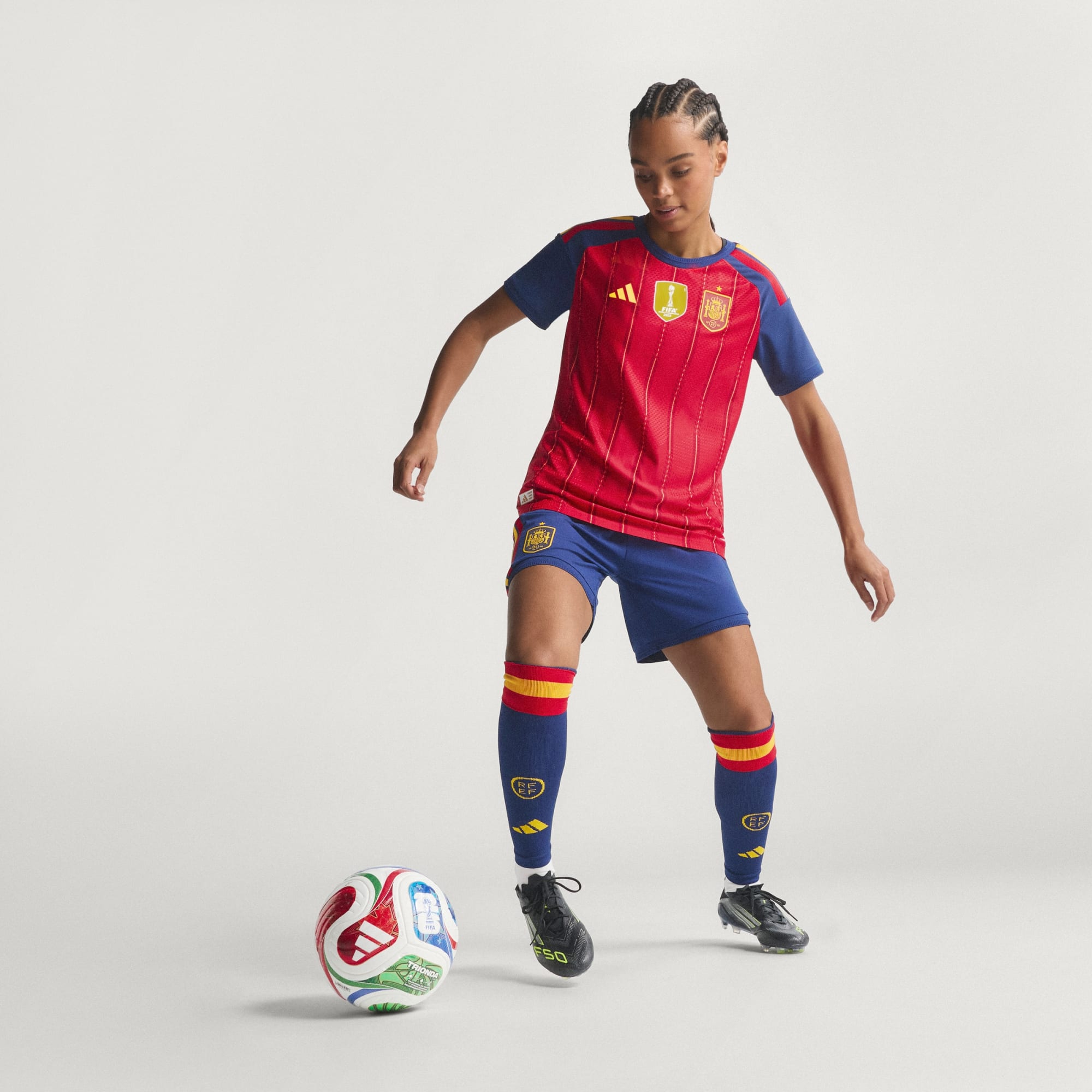 Il kit Home della Spagna per la FIFA World Cup 26™ porta sul campo i colori della bandiera nazionale. Il rosso acceso, il blu scuro e il motivo a righe sottili mettono in risalto l'eleganza del calcio spagnolo. Lo stemma cucito sul cuore dice tutto: per la Spagna il calcio è una passione pulsante.
